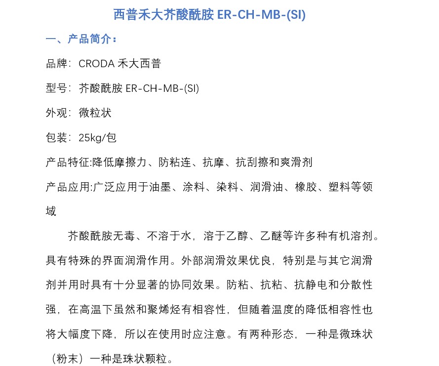 - 英国禾大CRODA芥酸酰胺 ER-CH-BE 物性表, 英国禾大CRODA芥酸酰胺 ER-CH-BE 产品参数,英国禾大CRODA芥酸酰胺 ER-CH-BE 性能表,英国禾大CRODA芥酸酰胺 ER-CH-BE 出厂报告, MSDS,, 物质安全资料表, UL黄卡,{ SGS报告, RoHS, 食品级认证, NSF饮用水标准, 产品资料, 产品性能, 出厂报告, 原厂原包, 代理商, 热变形温度, 熔指数, 流动系数, 抗冲击性能、冲击强度, 低温韧性、低温抗冲击性能, 熔体流动系数、熔体流动速率, 加工工艺、加工参数、加工温度, 欧盟RoHS 德国FDA 美国FDA 日本FDA