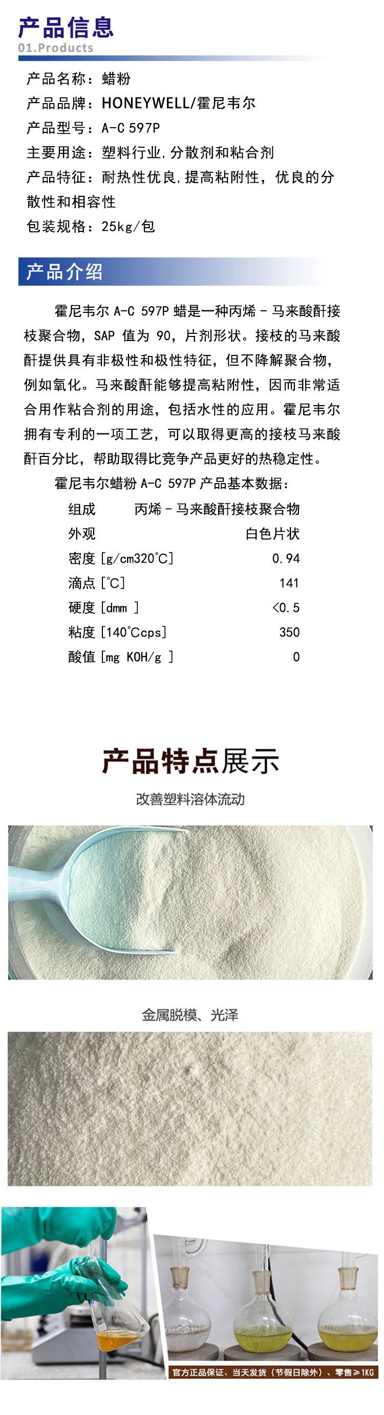 A-C® 597P丙烯-马来酸酐接枝聚合物,SAP 值为 90,片剂形状。非极性聚丙烯的功能,含马来酸酐,提供具有非极性和极性特征的低分子量共聚物。接枝的马来酸酐提供极性,但不降解聚合物,例如氧化。马来酸酐能够提高粘附性,因而非常适合用作粘合剂的用途,包括水性的应用。霍尼韦尔拥有专利的一项工艺,可以取得更高的接枝马来酸酐百分比,帮助取得比竞争产品更好的热稳定性。