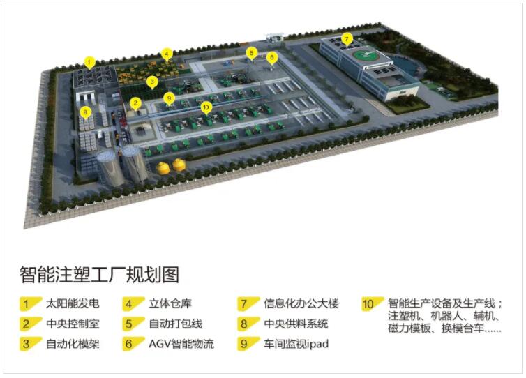 智能注塑工厂由中央供料仓库、立体仓库、模具仓库、中央控制中心(注塑云MES)、注塑成型模块、装配生产线、自动包装线等多个模块组成并通过物联传感将注塑机、冷水机、干燥机、机械手等设备信息在注塑机电脑上闭环控制,同时将数据传送给注塑云MES,可做到设备监控、生产管理、异常停机管理、模具管理、自动报表、派工管理等智能模块,提前做到风险防控、故障预知、趋势预测、精准营销、行业分析。根据客户需求生成BOM表等,并传递至ERP系统,根据订单相应的生产任务被传递至注塑云MES,自动识别注塑工厂智能排产。