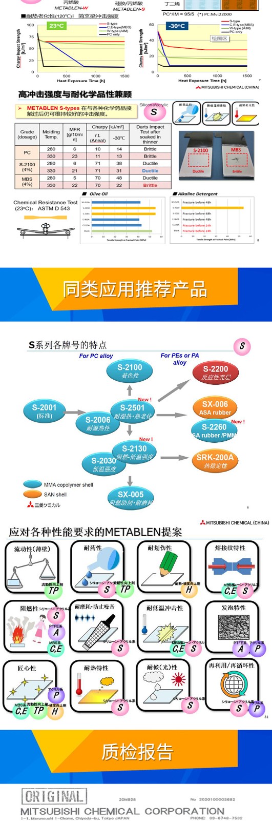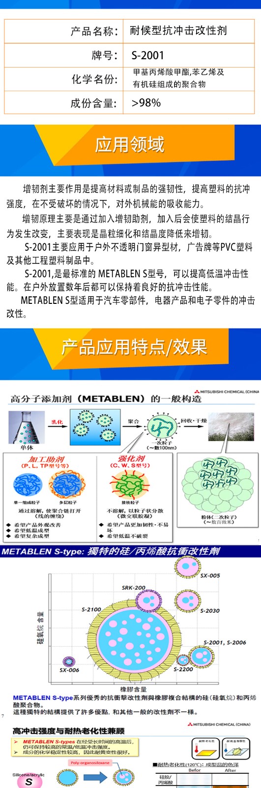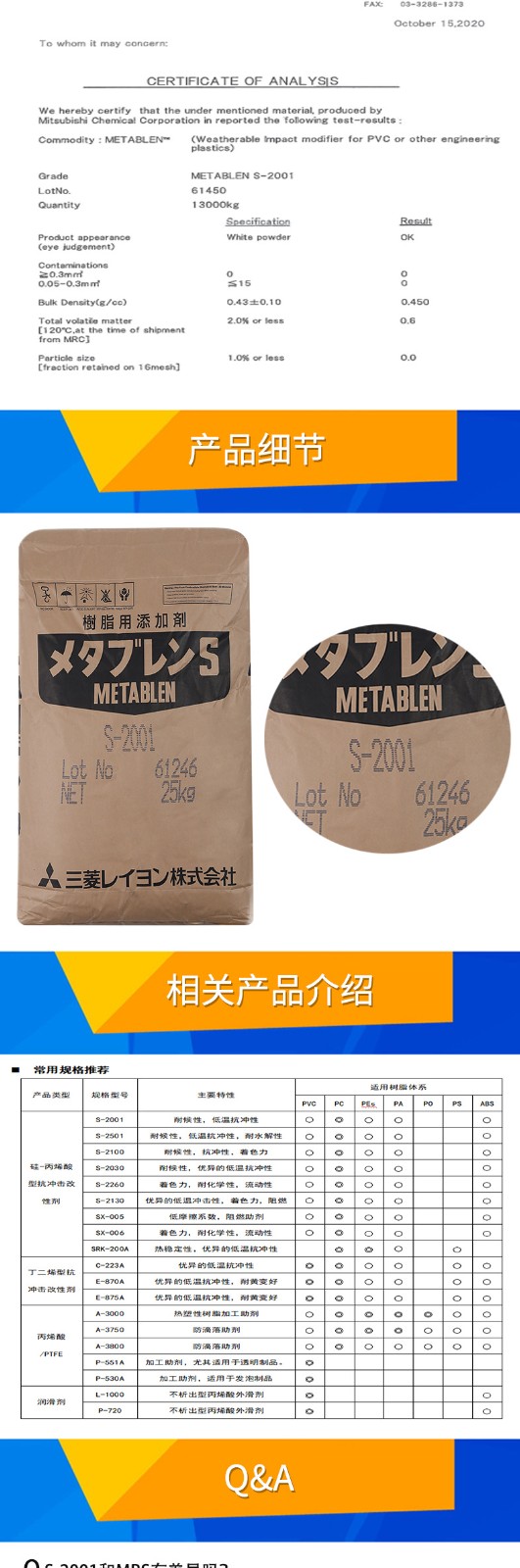- 日本三菱S2001增韧剂 塑料改性 PC增韧耐候耐寒 丽阳MBS S-2001 物性表, 日本三菱S2001增韧剂 塑料改性 PC增韧耐候耐寒 丽阳MBS S-2001 产品参数,日本三菱S2001增韧剂 塑料改性 PC增韧耐候耐寒 丽阳MBS S-2001 性能表,日本三菱S2001增韧剂 塑料改性 PC增韧耐候耐寒 丽阳MBS S-2001 出厂报告, MSDS,, 物质安全资料表, UL黄卡,{ SGS报告, RoHS, 食品级认证, NSF饮用水标准, 产品资料, 产品性能, 出厂报告, 原厂原包, 代理商, 热变形温度, 熔指数, 流动系数, 抗冲击性能、冲击强度, 低温韧性、低温抗冲击性能, 熔体流动系数、熔体流动速率, 加工工艺、加工参数、加工温度, 欧盟RoHS 德国FDA 美国FDA 日本FDA