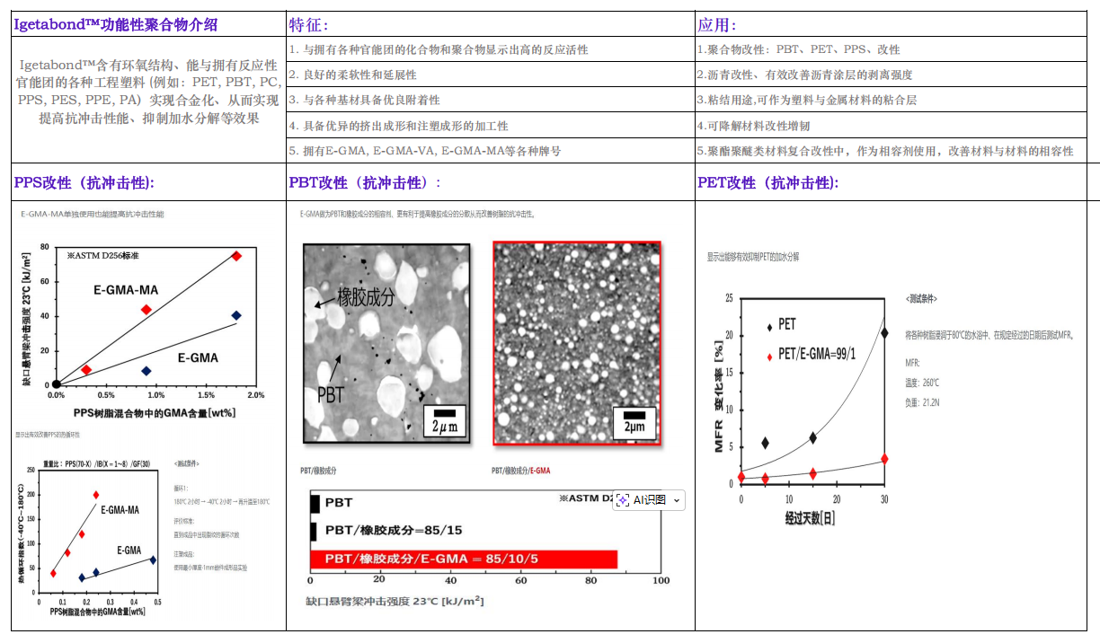 用途:作为反应型改性剂,添加2-10%有效地提高PBT/PPS/PET等工程塑料以及合金的抗冲击强度以及热疲劳性能。此外,还可以用来热粘结各种塑料和金属等材料的用途。