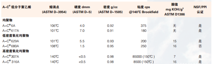 粉末状的低密度聚乙烯 (LDPE),用于溶剂型涂料、热定形和液体溶剂型油墨,以便通过降低磨擦系数 (COF) 提高耐擦伤性和耐磨性等表面属性。它还用作烃油的胶凝剂、蜡混合物(例如蜡烛)中的石蜡晶体成核剂和 HMA 中的粘度稀释剂。在粘合应用中,可以部分地替代费托蜡,而且不会降低配方特性。在 PVC 应用中,用作外部润滑剂。
